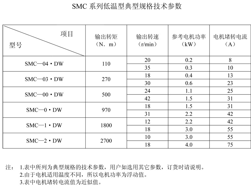 SMC系列低溫型閥門電動裝置是在其普通型的基礎(chǔ)上,對主箱體等受力零件的材料,電控器件和導(dǎo)線的材料,橡膠密封件的材料,潤滑脂,電動機的性能和功率選用等均采取了相應(yīng)措施,以達到產(chǎn)品應(yīng)具備的低溫性能。該系列產(chǎn)品連接尺寸及外形尺寸均與SMC系列各尺寸相同。