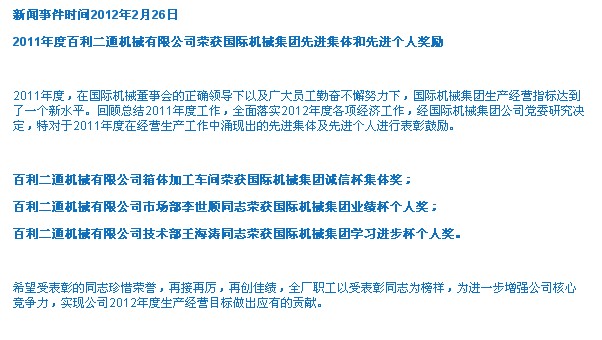 百利二通機(jī)械有限公司先進(jìn)集體和先進(jìn)個人表彰