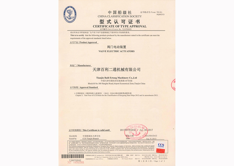 天津百利二通機(jī)械有限公司作為國內(nèi)首家,也是國內(nèi)唯一獲得中國船級社CCS國際航行船舶范圍閥門電動裝置產(chǎn)品型式認(rèn)可證書單位。2013年8月8日,公司順利通過2009年型式認(rèn)可證書到期換證工作。