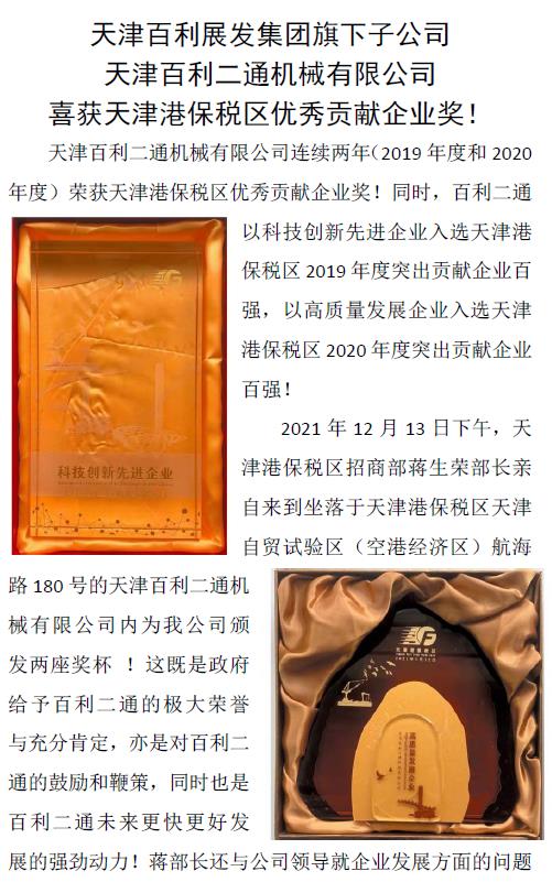 天津百利二通機(jī)械有限公司 喜獲天津港保稅區(qū)優(yōu)秀貢獻(xiàn)企業(yè)獎(jiǎng)